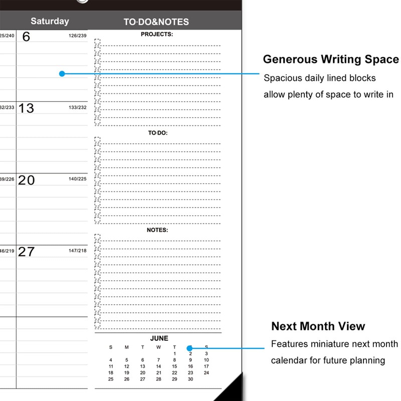 - Design: desk calendar has a wide, black paper top binding with eyelets for hanging and two black corners keep pages flat during hanging or desktop use. Tear off can move onto the next month page with ease