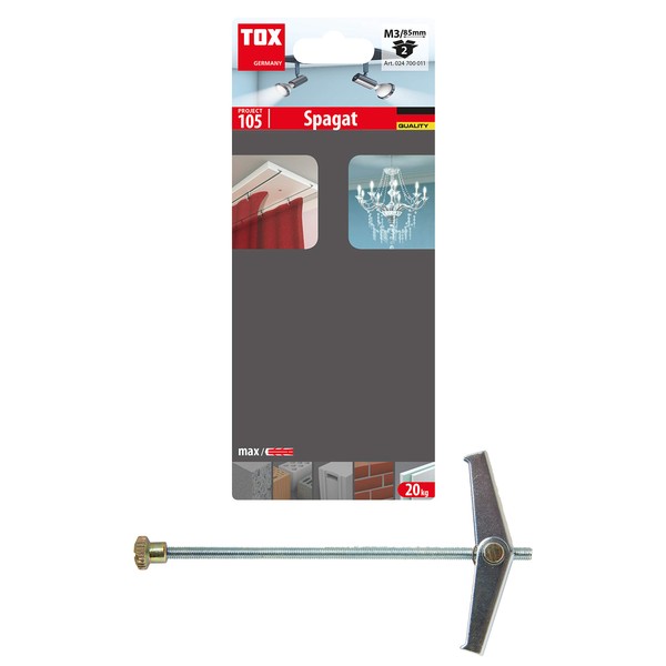 • The TOX spring folding dowel Spagat is a galvanised cavity folding dowel made of metal with two folding wings, including a metal washer and a knurled nut