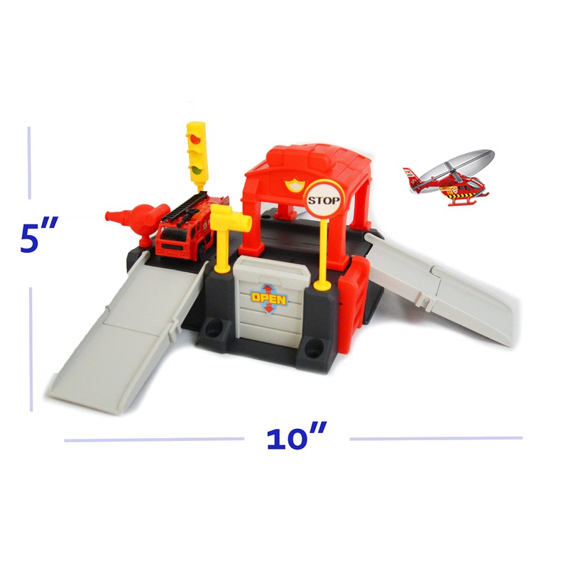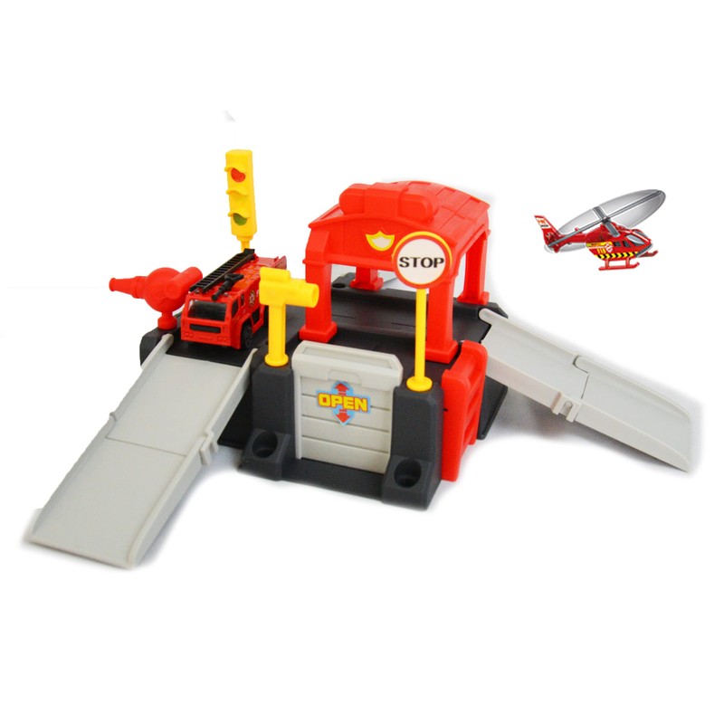 - Fire Truck Garage Set: This is a strong, sturdy and durable die-cast fire truck garage set which includes a garage, car slides, a toy firefighter truck with resuce ladded and a helicopter. This package gives maximum bang for your bucks with one single package providing your kids with several fun things to do. The garage toy set is built to last, with durable, safe and strong materials and is also educational and fun for the kids