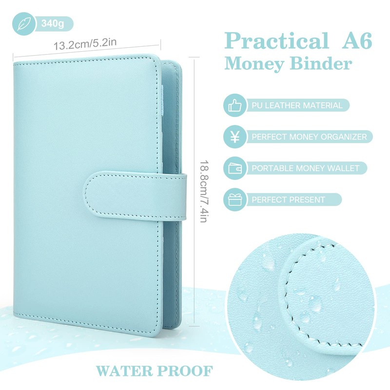 TOYESS 30Pcs Budget Binder Set for Money Saving Wallet, A6 Leather Money Binder with 12 Cash Envelopes, 12 Budget Sheets, Ring Binder Money Organiser for Budget Planner, Macaron Light Blue