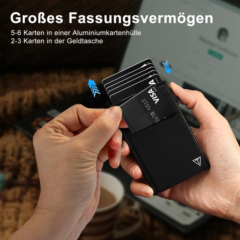 - 【ELIMINATE HEAVY BULKY WALLETS】:Upgrade to a slim metal pop up wallet for men. Large capacity for 6 cards. Extra elastic wallet for cash, coins or 3-4 cards. Actual capacity depends on card thickness.