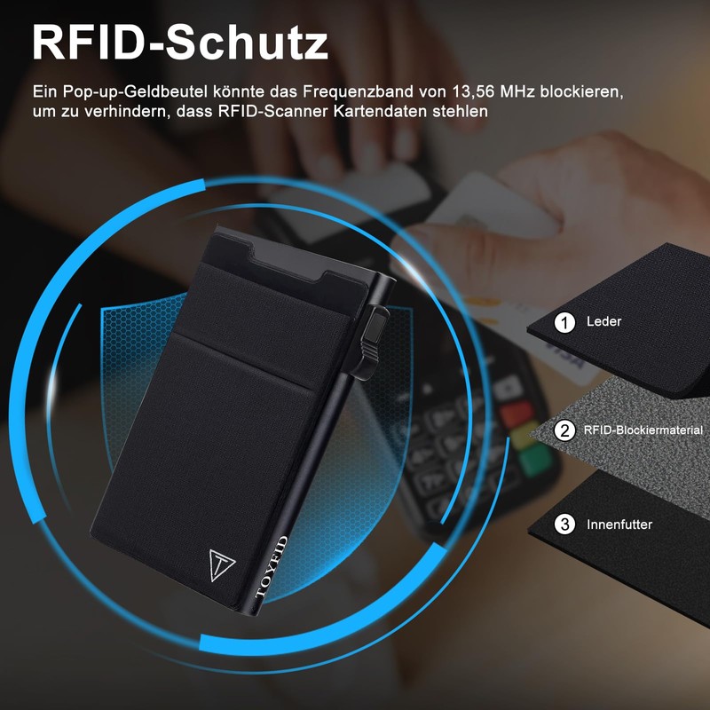 - Prevent credit card theft: Toyfid anti-theft aluminium slim credit card wallet made with RFID blocking technology ensures protection against fraud Stay safe and protected: This front pocket effectively blocks 13.56 MHz frequencies (debit/credit cards) even from the strongest RFID scanners and chip readers