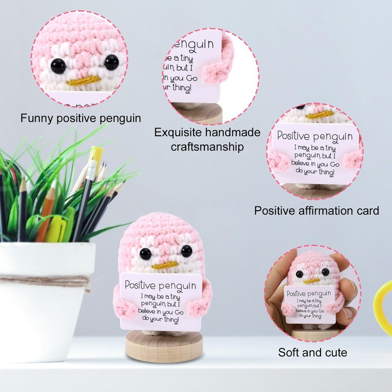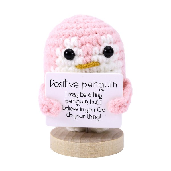 TOYMIS Funny Positive Penguin, 6 cm Crochet Penguin Doll with Positive Card and Wooden Base, Knitted Penguin Support, Positive Potatoes, Encouragement Gifts for Friends (Pink)