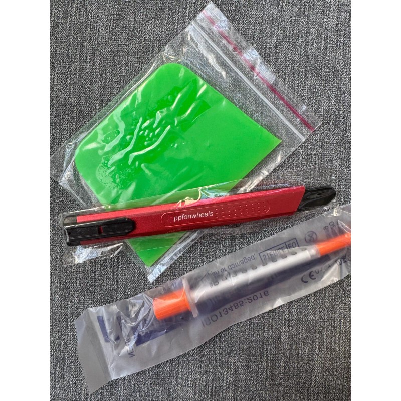 🟢 - Squeegee, knife for installation; All other stuff you have in your garage (sprayers, towels), not necessary to buy extra trash tools from another offers;