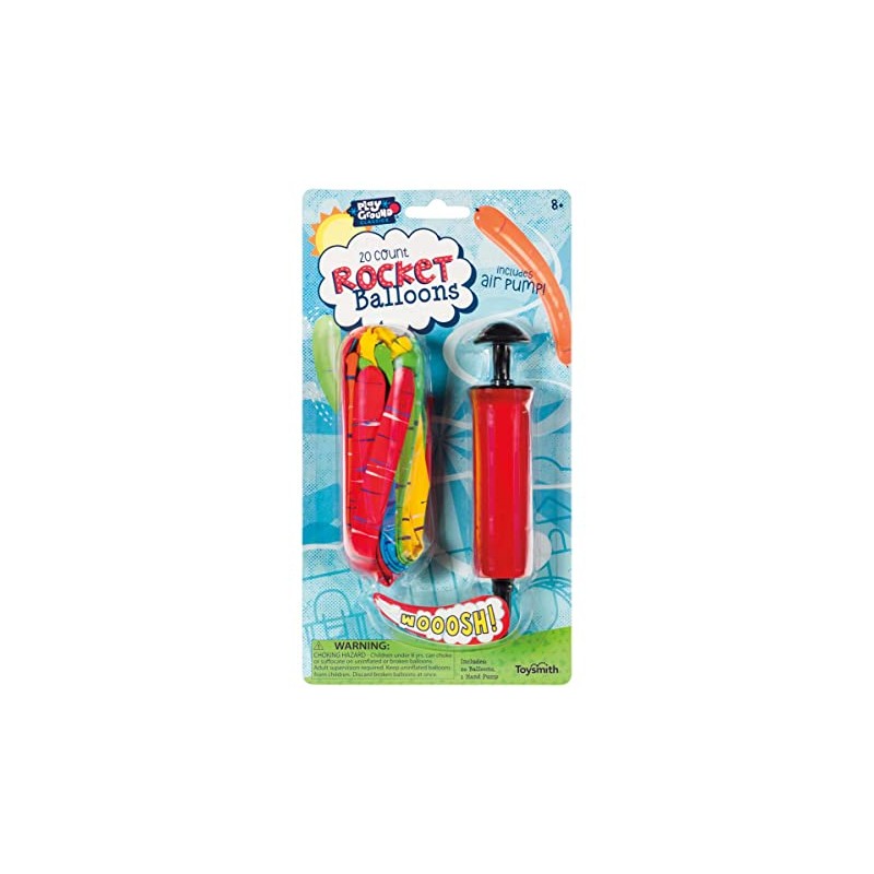 Product DescriptionSend balloons soaring with the Toysmith 20 Rocket Balloons with Pump Set. Your children will enjoy hours of fun sending balloons zooming through the air with loud, silly noises. Just attach a multicolored balloon, push and pull the pump, and let a balloon fly. The balloon soars to the sky with a silly shriek, drawing kids in for a turn at the pump. Attaching and inflating the multicolored balloons is made easy thanks to the included kid-friendly hand pump. Help your kids build hand and arm strength and hand-eye coordination with this simple yet brilliant balloon rocket set. Give kids the gift of science with toys that foster curiosity and encourage scientific learning. Recommended for ages 8 and up.From the ManufacturerInflate the balloon with the Toysmith Rocket Balloon Set pump and then let it go! Watch as the balloon zooms and soars. Includes 7" pump and 20 assorted color latex balloons. Ages 8 and up.