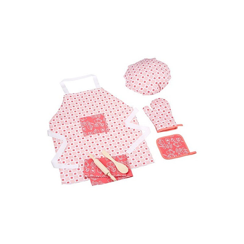 Deluxe Chef Set is the perfect gift for mom's little helper. Set includes apron with adjustable straps, chef's hat, hot pad, oven mitt, tea towel, spoon and rolling pin. Fabric is 100% cotton.