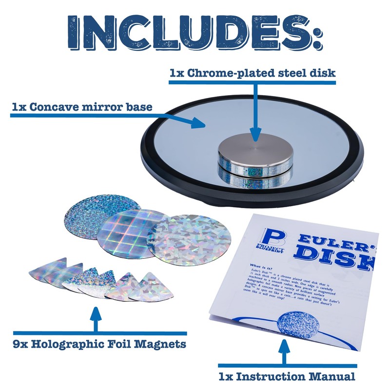 - Euler’s Disk features: These kinetic desk toys come complete with full instructions, 6 disks to spin, the concave mirror for the disk to spin on, and 9 pieces of magnetized holographic foil for a variety of brilliant surface designs