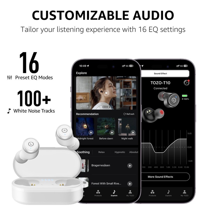 - [Customize EQ with TOZO App] Compatible with TOZO App, you can freely switch between 16 EQ modes and explore various styles of music. Personalize your listening experience by adjusting specific frequencies to bring you an auditory feast, plus you can adjust the touch settings yourself.