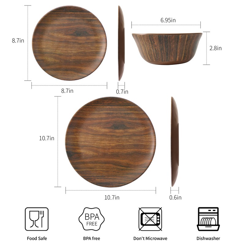 - Exquisite Craftsmanship: Imitation of natural wood grain texture design, adding charm to your dining table for casual settings and formal gatherings, dinner services for 4 including 32 oz bowls, 11’’ dinner plates, 9” salad plates.