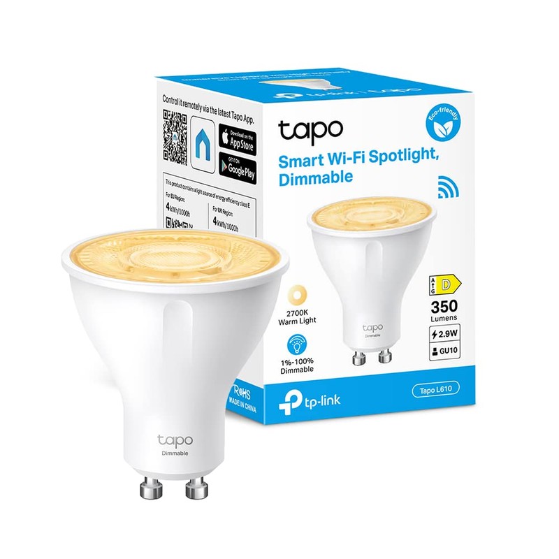 TP-Link Tapo Smart Wi-Fi Spotlight, Smart Home Security System, Energy saving, Dimmable, 2700K Warm Light, GU10, 3.7W, Remote & Voice Control, Schedule & Timer, No Hub Required (Tapo L610)