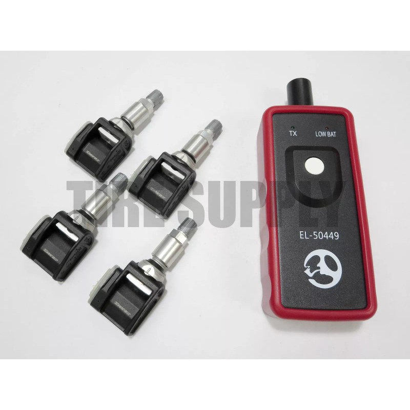 Set of (4) Schrader 33500 TPMS sensors with silver aluminum clamp in valve stems and (1) TPMS reset tool.