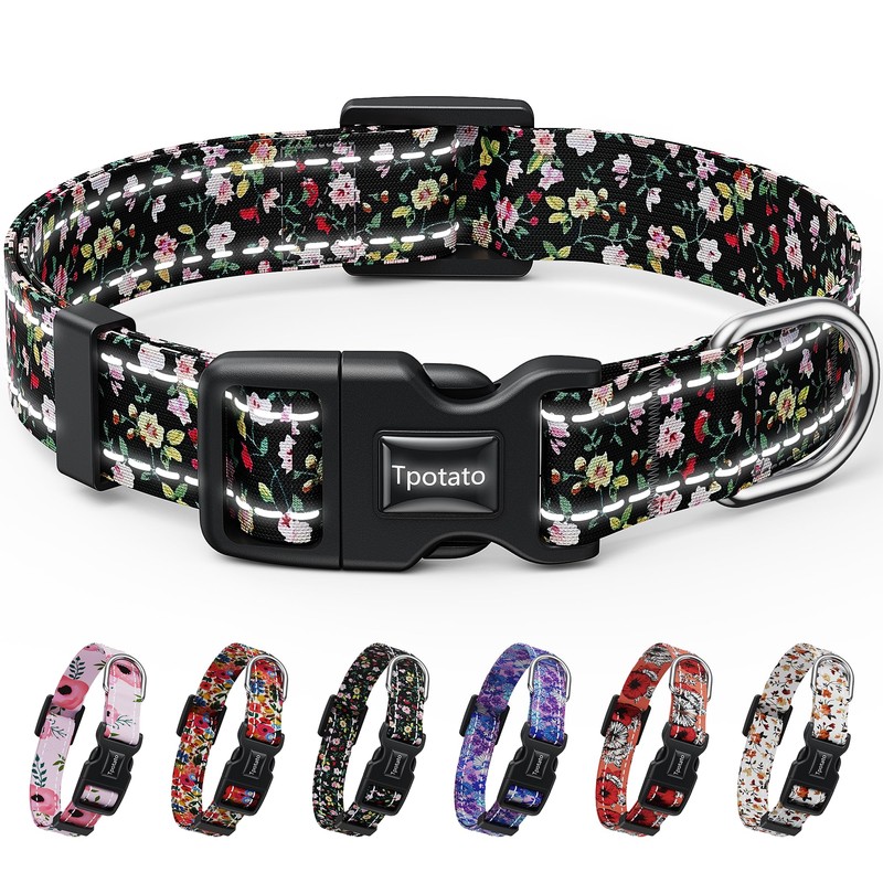 Tpotato reflective combination pattern girl dog collars for puppy small medium large breed female dogs,adjustable cute floral designer dog collar