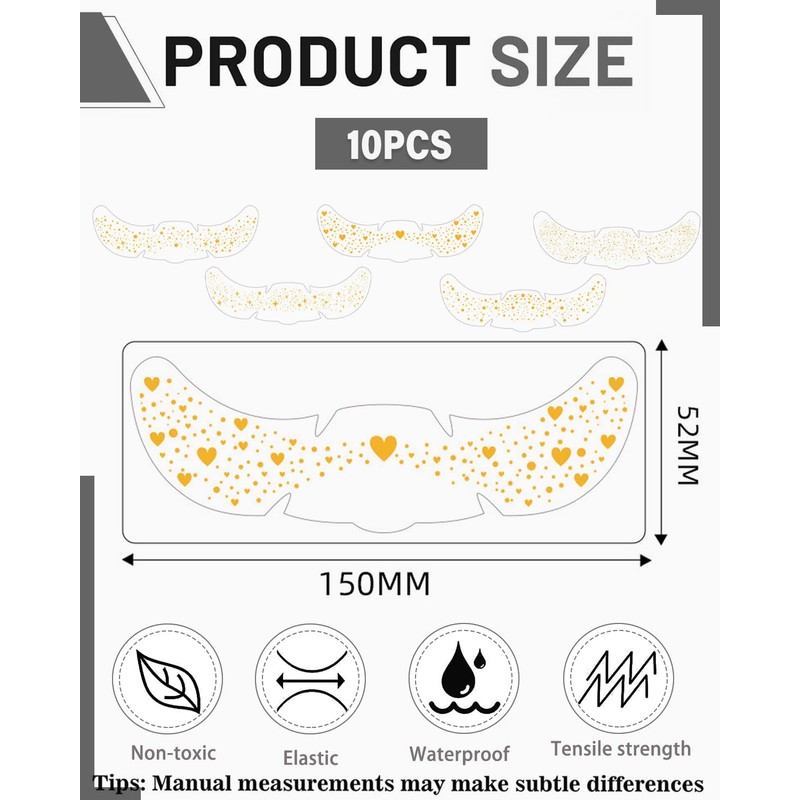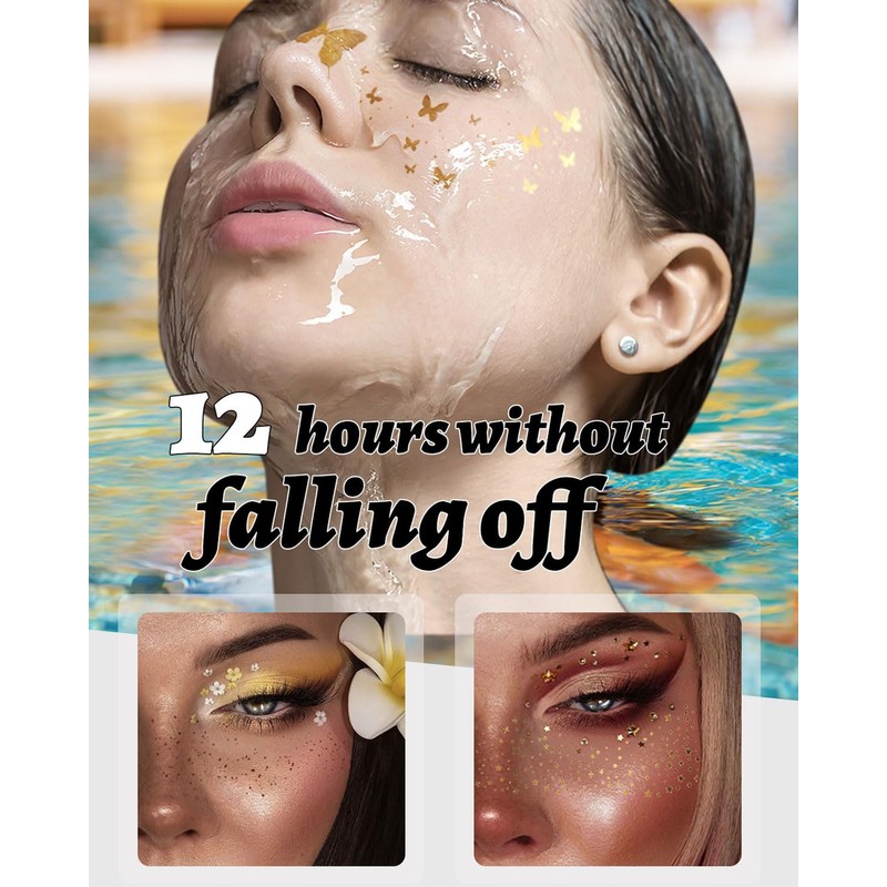 - Langanhaltender Glanz: Die goldenen Glitzer-Sticker halten den ganzen Tag und sind schweiß- und wasserabweisend. Diese Gesichts-Make-up-Aufkleber sorgen für einen langanhaltenden Glanz, der auch bei Feuchtigkeit und langen Nächten erhalten bleibt