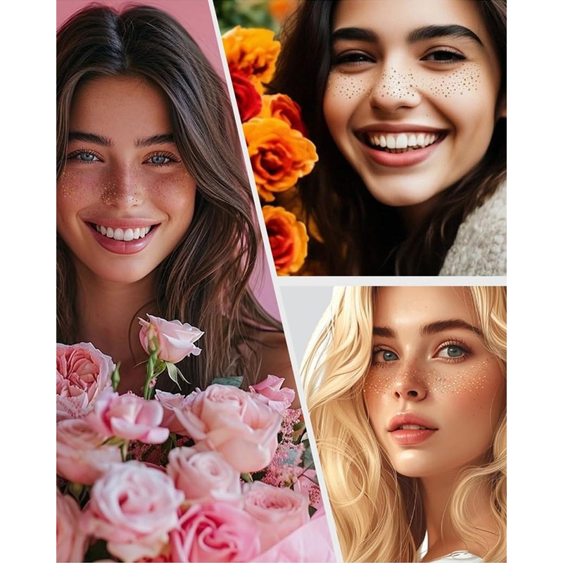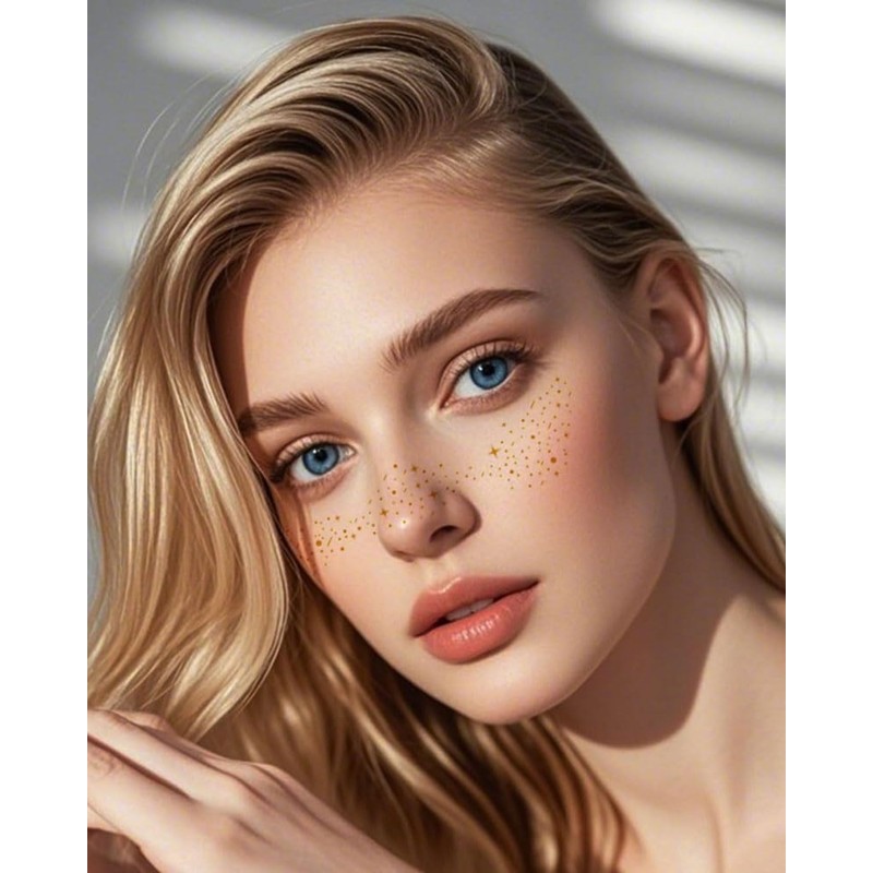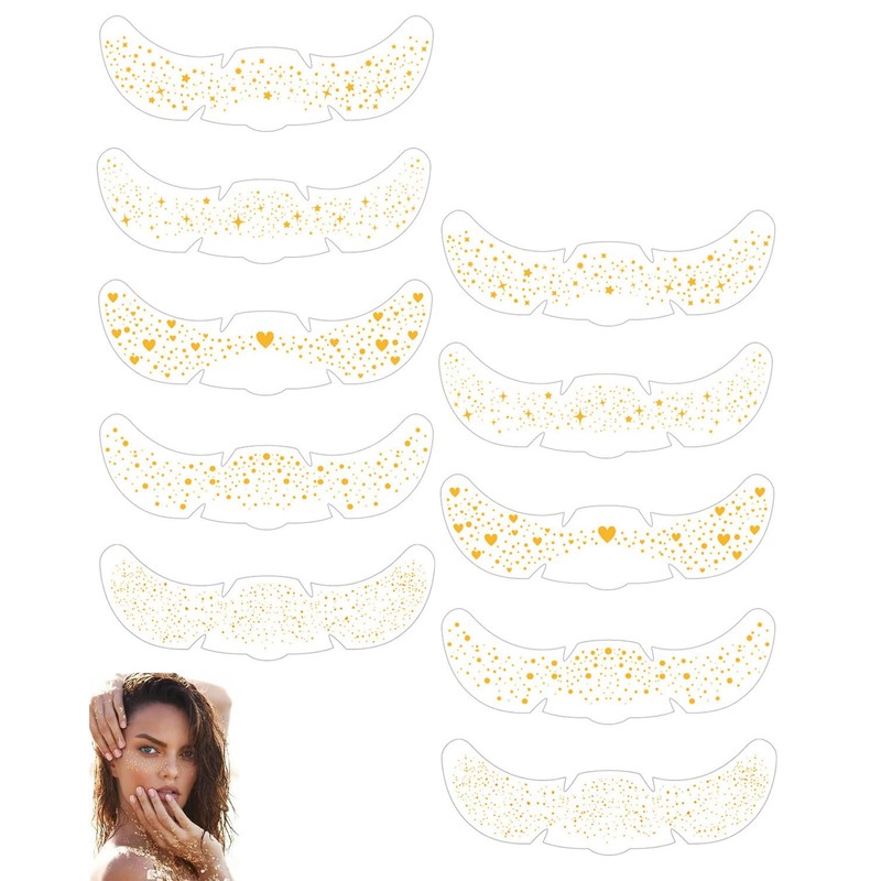 - Sommersprossen mit goldenem Glitzer: Diese Sommersprossen mit goldenem Glitzer sind sanft zur Haut und verleihen Ihrem Look einen funkelnden Touch. Sie erhalten 10 Stück von 5 verschiedenen temporären Tattoos für einen vielseitigen Look und können den Goldglanz je nach Anlass ändern
