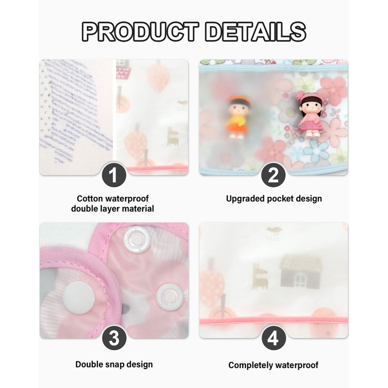 - Waterproof Bibs: These long-sleeved baby bibs are made of waterproof polyester fabric. They are lead-free, PVC-free, BPA-free, phthalate-free and vinyl free. Safe for babies and suitable for infants and toddlers from 6 to 24 months.