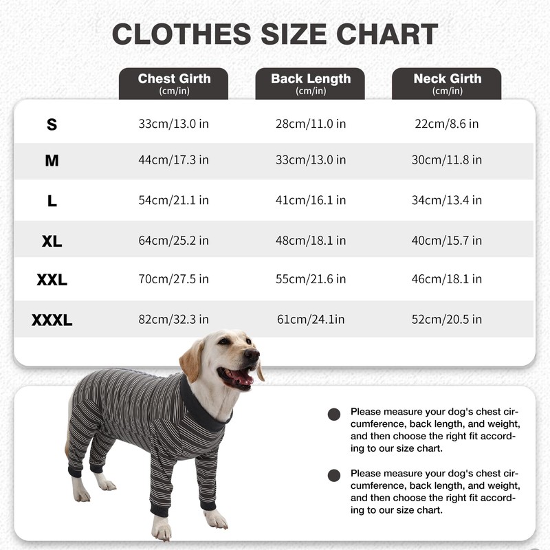 - Multiple Size Options: This pet long sleeve bodysuits are carefully designed in 6 sizes, ranging from S to XXXL, to fully meet the needs of different dog breeds and body types. Both small and large dogs can find the appropriate size. You can measure the circumference of your pet based on the size chart to avoid making incorrect choices.