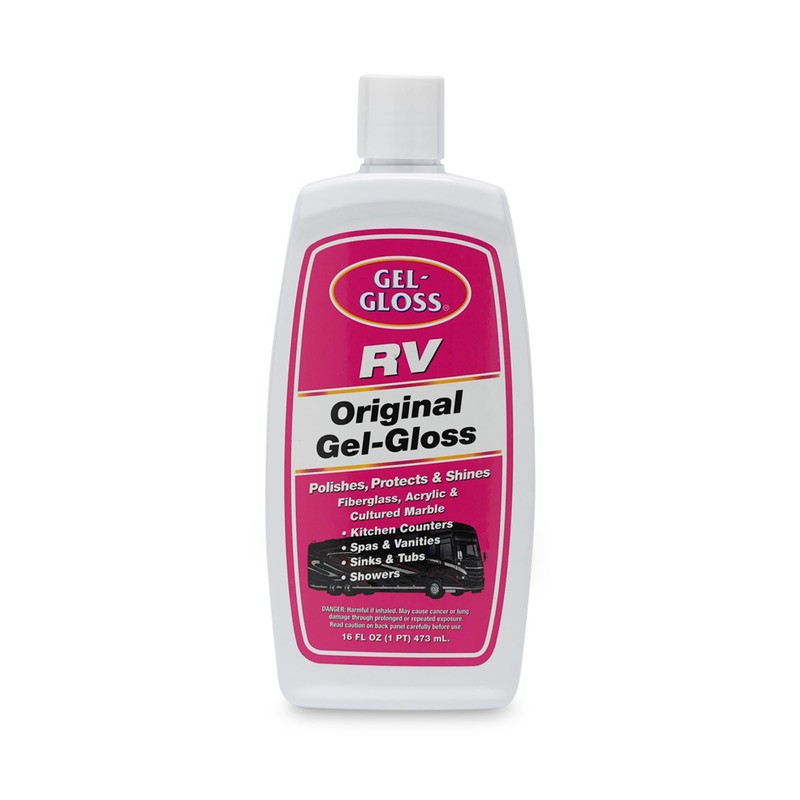 TR Industries Gel-Gloss Fiberglass Cleaner/Polish 16-ounce Bottle. Beautifies anything made of fiberglass or marble. Combines the most powerful cleaning agents with the most effective Carnauba waxes to produce the highest surface luster possible. Removes water spots; cleans, shines and seals fiberglass and acrylic surfaces. Prevents dirty water build-up. Long lasting finish requires little care. Excellent for the inside and outside of RVs, as well as tubs, showers, spas, basins and stainless steel surfaces. Recommended by fiberglass manufacturers. (Not for sale in Quebec).