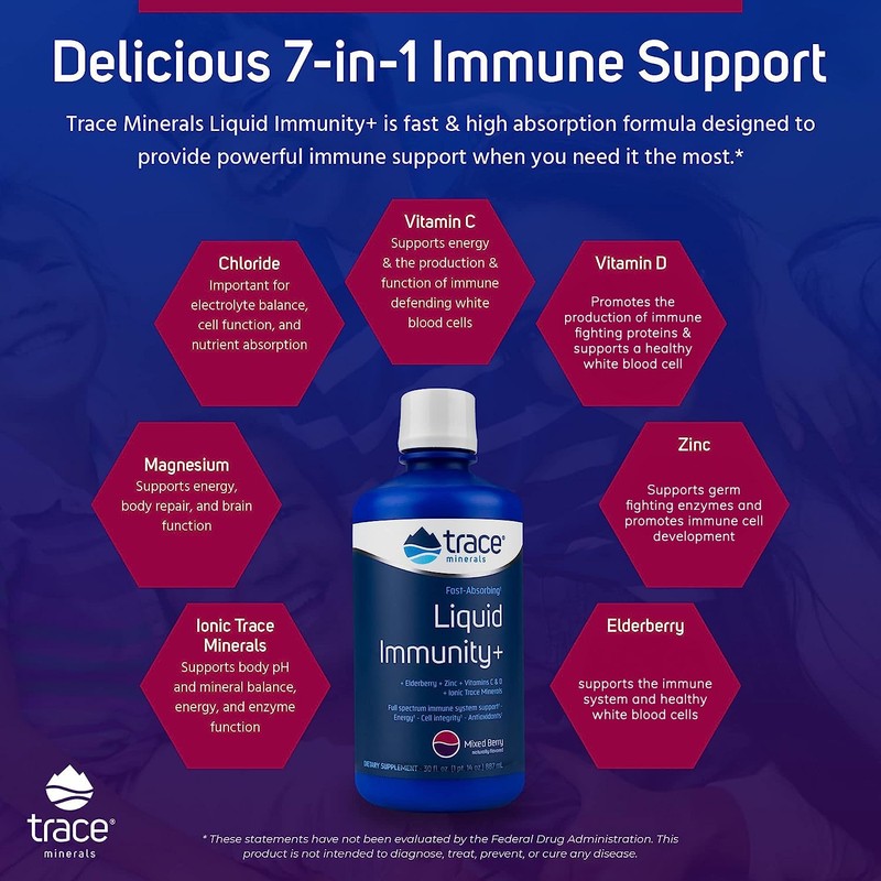 Trace Minerals | Liquid Immunity+ with Elderberry, Zinc, Vitamins C & D, Ionic Trace Minerals | Fast Absorbing, Sugar Free Immune Support, Gluten Free, Vegetarian Certified | Mixed Berry | 30 oz