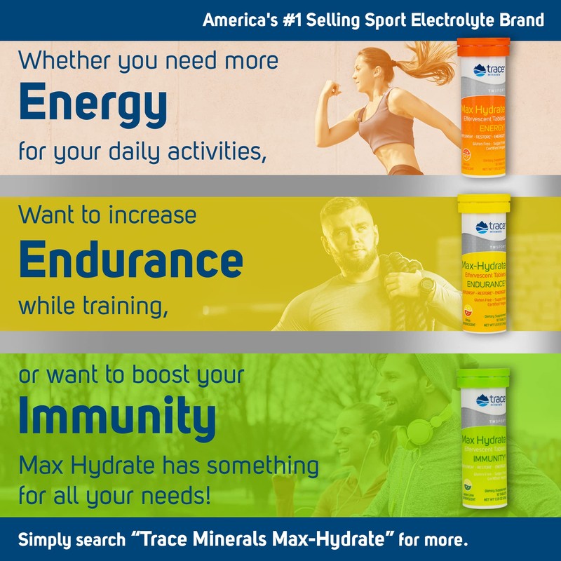 Trace Minerals | MAX Hydrate Immunity | High Performance Electrolyte Fizzing, Immune Support | Magnesium, Sodium, Potassium, Vitamin C Non GMO | Lemon Lime | 8 Tubes of 10 Tablets
