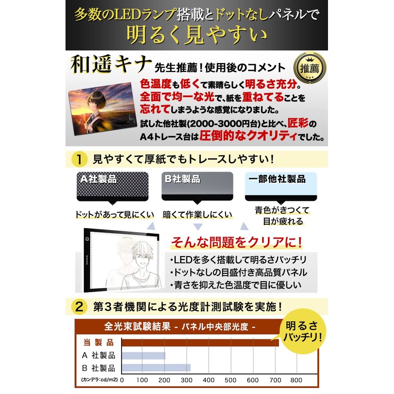 - (Quality Confirmation by a Third-Party Organization) We check the product by a Japanese testing agency to ensure the quality of the light table. Recommended by professional illustrators and we will deliver products with confidence; The panel is made of high quality materials that are easy to see and bright so it is perfect for tracing, drawing, drawing and reporting