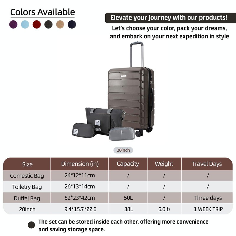 - CARRY-ON LUGGAGE: The 20-inch hard-side carry-on luggage is affordable and approved for all major airlines. It is 9.4''x15.7''x22.6'' in size, making it perfect for hassle-free travel. The set includes a duffel bag, a cosmetic bag, and a toiletry bag. These are designed for the convenient storage of your grooming essentials and can be easily taken aboard a plane, ensuring a smooth and hassle-free travel experience. Capacity: 20In38L