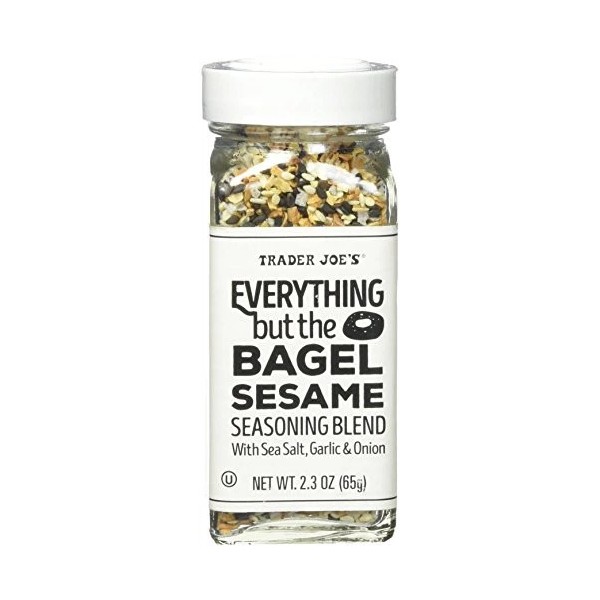 Trader Joe's Everything but The Bagel Sesame Seasoning Blend is the only everything seasoning you’ll ever need for decorating and yummifying the tops of bagels—but that's not everything. This simple (yet exemplary) blend of Sesame seeds (white and black), poppy seeds, dried garlic & onion, and sea salt flakes is all you need for bringing that crunchy, roasted, savory flavor to grilled chicken, buttered popcorn, baked potatoes, creamy dips, pizza dough, salad dressings, pasta, Mac & cheese, or anything.