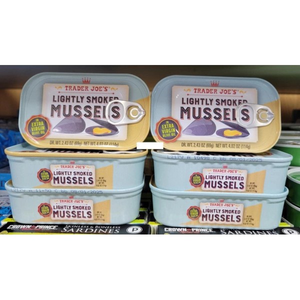 TRADER JOE'S LIGHTLY SMOKED MUSSELS IN EXTRA VIRGIN OLIVE OIL 4oz EA , 6 packs