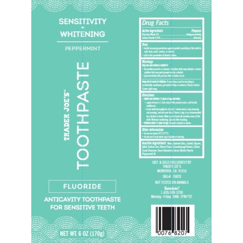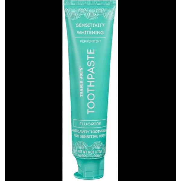 Trader Joe's Peppermint Toothpaste with Baking Soda Fluoride is a 6 oz tube of toothpaste designed for sensitive gums and cavity protection. Made in the United States, this fluoride toothpaste also has teeth whitening properties. The peppermint flavor adds a refreshing element to your daily dental care routine. With a set of three tubes, this product offers long-lasting freshness and protection.