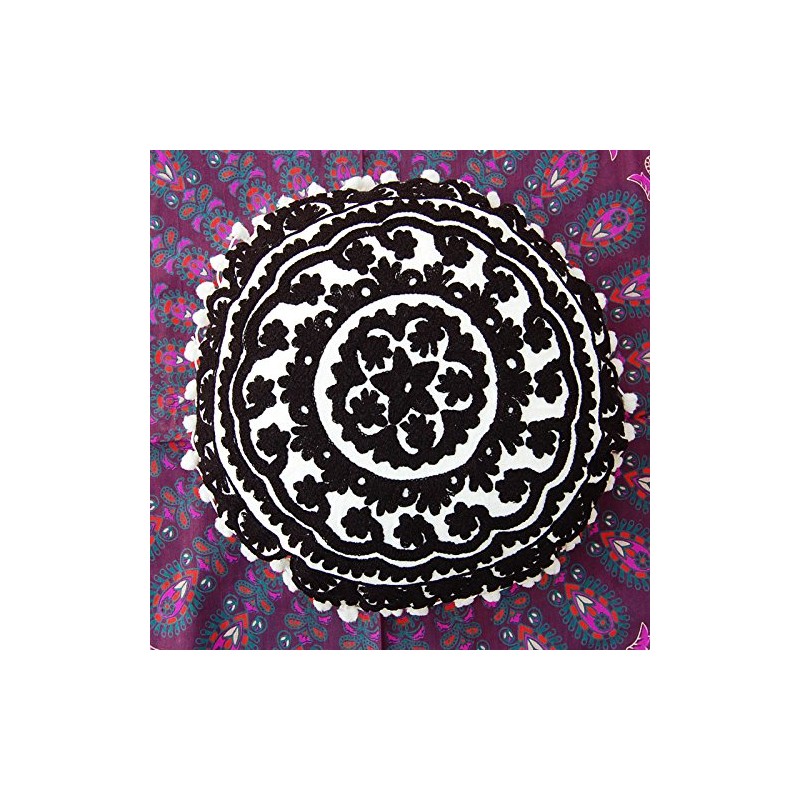 Traditional Jaipur Boho Throw Round Suzani Cushion, Embroidered Cushion Covers, 16 Inches, Decorative Cushion Covers, Indian Pom Pom Outdoor Pillow, Boho Pillow Shams