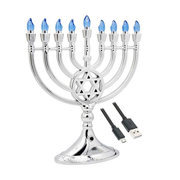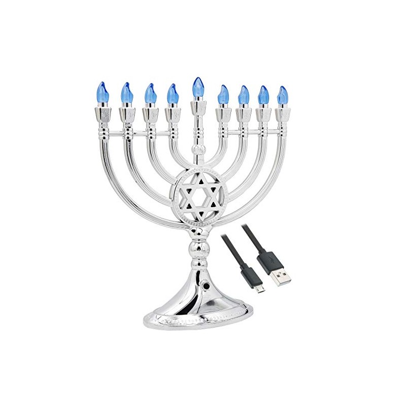 - ELECTRIC MENORAH: Traditional LED Electric Silver Hanukkah Menorah With Crystals - Battery or USB Powered - Includes a Micro USB 4' Charging Cable.
