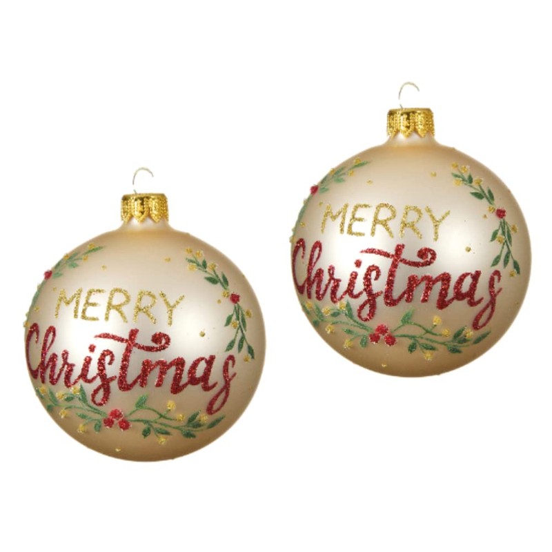 Traditional Round MERRY CHRISTMAS Message Tree Bauble/Hanging Decoration - Champagne Gold, Red, Green - 8 cm