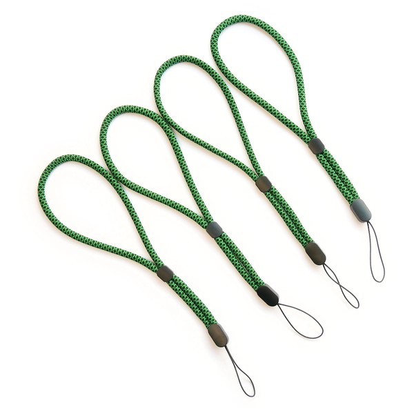 - Box contents: four black and green patterned adjustable short wrist lanyards
