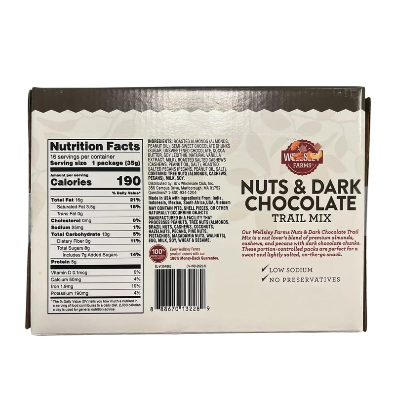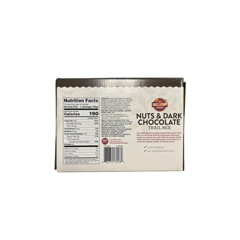Satisfy your snacking cravings with rail Mix with Dark Chocolate and Nuts. This convenient 16-pack of individually portioned trail mix combines the rich, indulgent taste of dark chocolate with a carefully selected blend of premium nuts. Perfect for on-the-go energy boosts, afternoon pick-me-ups, or mindful snacking at your desk, this trail mix offers a delightful balance of sweet and savory flavors. The individual packs help with portion control and keep the mix fresh, while making it easy to toss in your bag, lunchbox, or desk drawer. Whether you're hiking, working, or simply need a satisfying snack, this trail mix delivers a delicious combination of textures and tastes. The mix of nuts provides protein and healthy fats, while the dark chocolate adds an irresistible touch of sweetness to every handful.