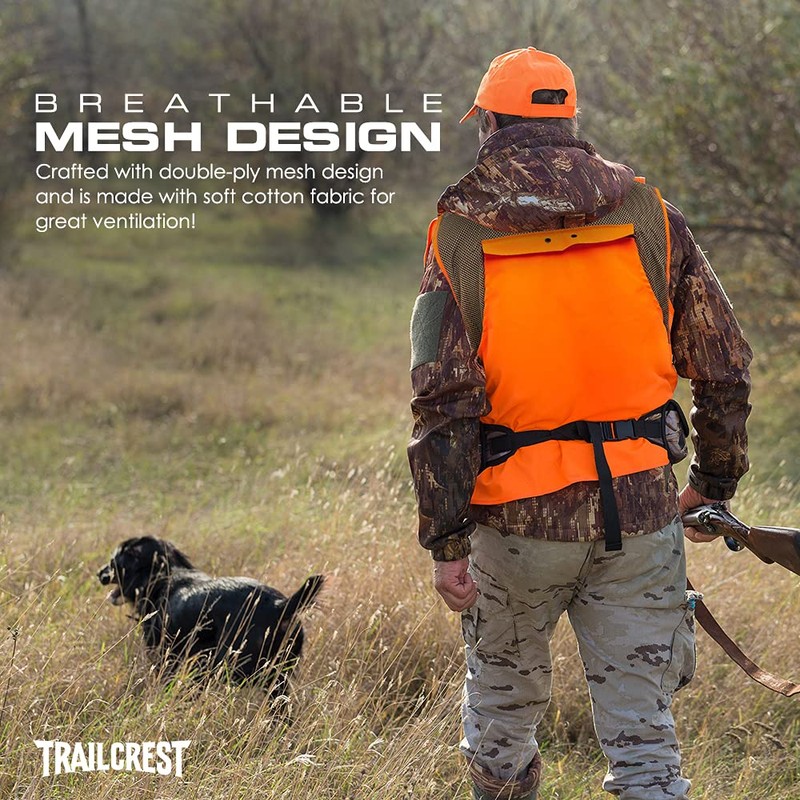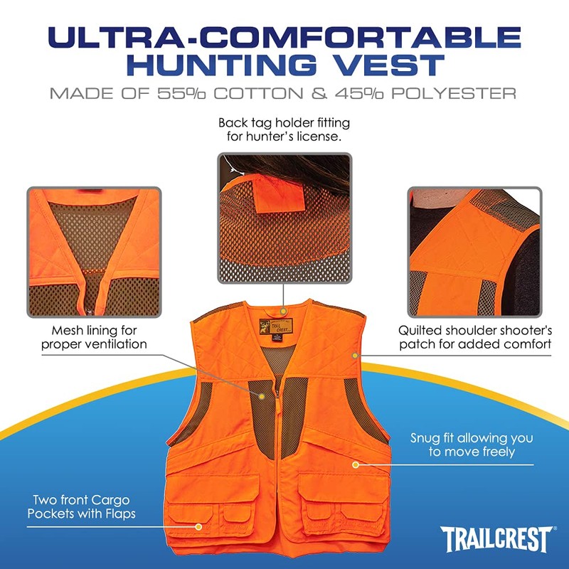 - LEVEL UP YOUR HUNTING GAME - TrailCrest Safety Vest provides you an extra layer of protection and security without adding unwanted weight and bulk to your hunting gear. It is super lightweight yet extremely durable with its cotton-poly blend (55% Cotton and 45% Polyester).