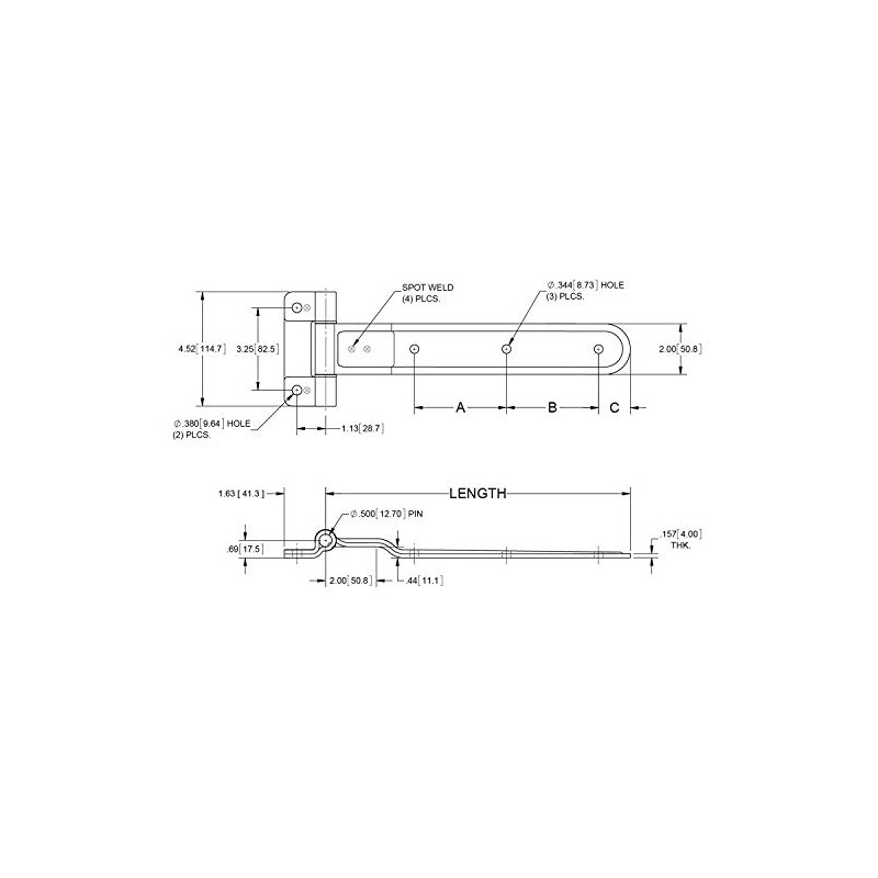 This 12" steel door hinge features a narrow bracket and is designed to bridge the door molding or door seal. It also features a narrow bracket for mounting where space is limited. 1/2" diameter steel pin is non-removable. Bracket is 8 gauge steel, 4-1/2" x 1-5/8" from center of pin. Strap is 8 gauge steel, 2" x 12".