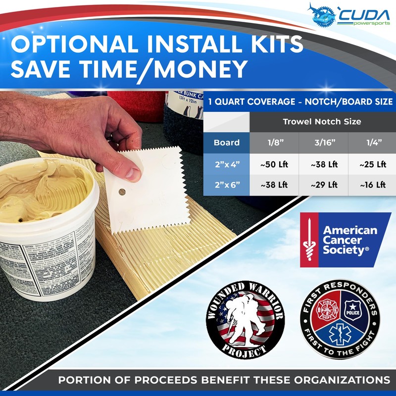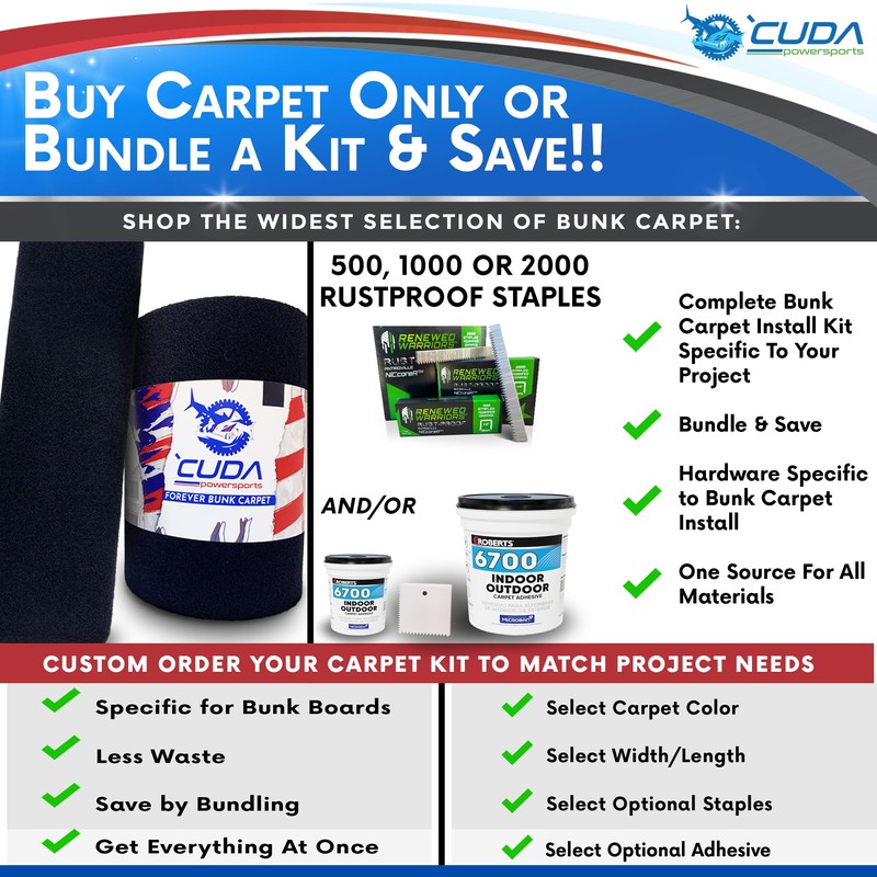 - CARPET INSTALL KIT - 'Cuda's Carpet Install Kit takes guess-work out of marine bunk carpet install. Includes adhesive, staples & notched trowel. FOREVER Boat bunk board carpet needs adhesive to ensure longevity of boat trailer carpeting