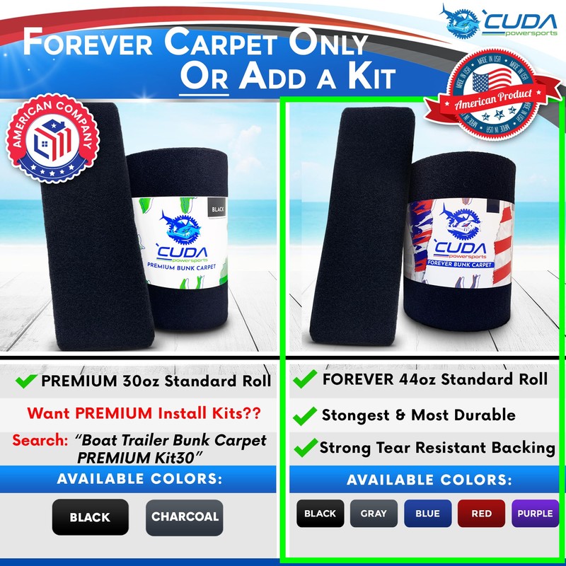 - 20-YEAR ASSURANCE-Cuda's FOREVER marine grade bunk carpet is designed to be the last bunk carpet you’ll ever buy! Tear/Stretch Resistant Backing, Superior boat trailer carpet backing, leading UV Inhibitors & 'Cuda's expert hardware.