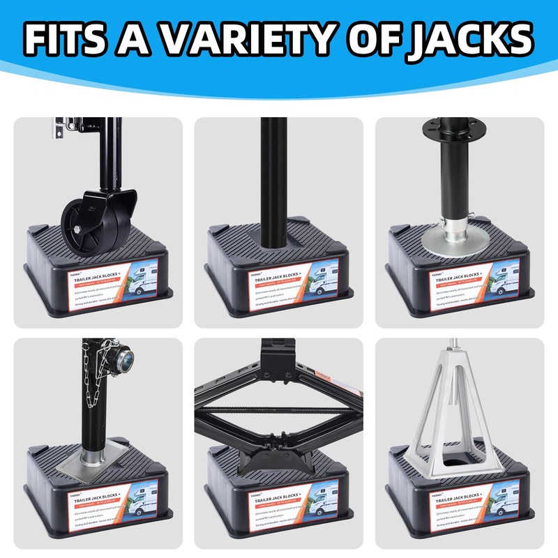 - Universal Compatibility: The trailer jack block is designed to work with a wide range of jacks including scissor jacks, tongue jacks, wheel jacks, and more. Ideal for RVs, campers, boat trailers, and utility trailers—making it the ultimate go-to stabilizer solution