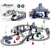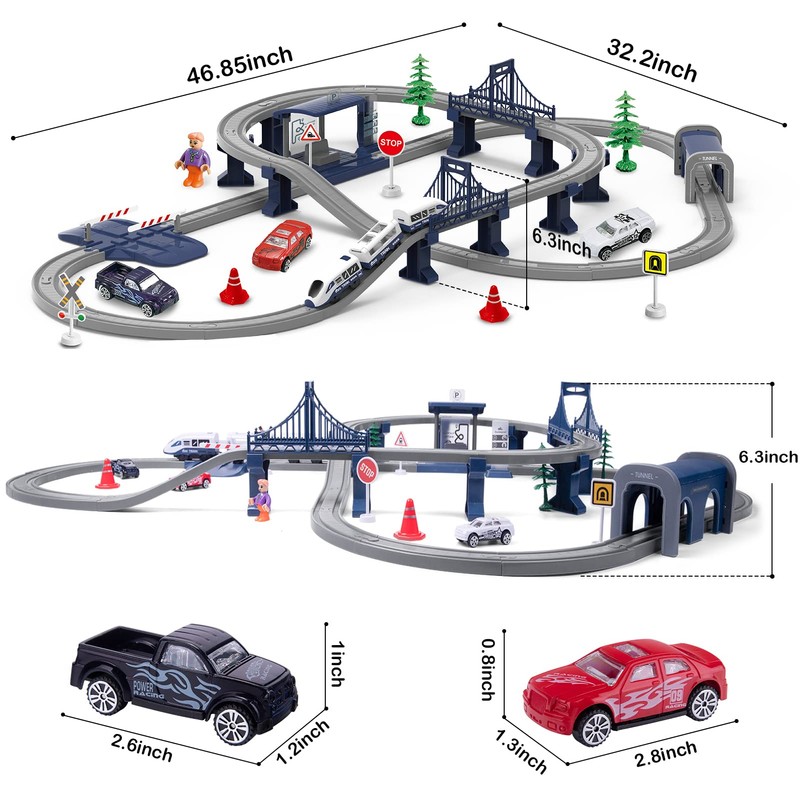 - 【DELUXE TRAIN PLAYSET】This train tracks set toys designed for children has a total of 104 pcs accessories including train, police cars, helicopter, bridge, track, people images, road signs, street lights, and other accessories. Drivers can get off and train cars can be separated.