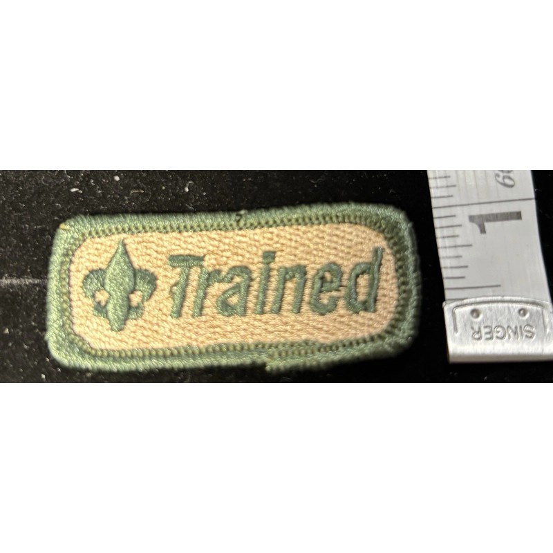 The product is a vintage Boy Scout patch featuring a tan strip and the slogan "trained “The patch is backed by a green border and is described as being in mint condition. This collectible item holds historical significance as it belongs to the fraternal organization known as the Boy Scouts, making it a sought-after piece for collectors of badges and patches related to the scouting movement.