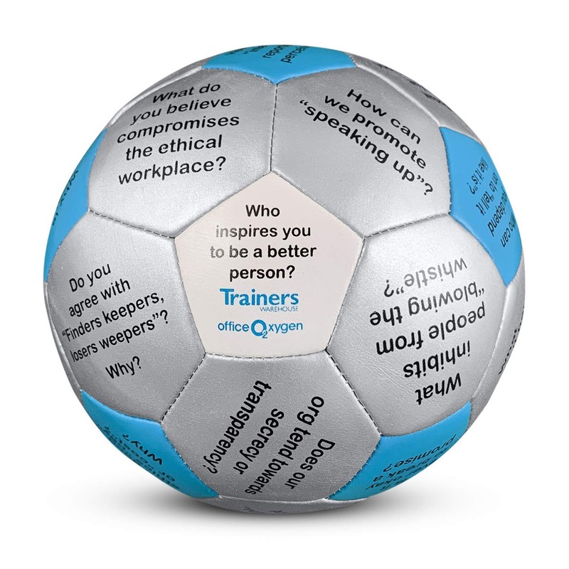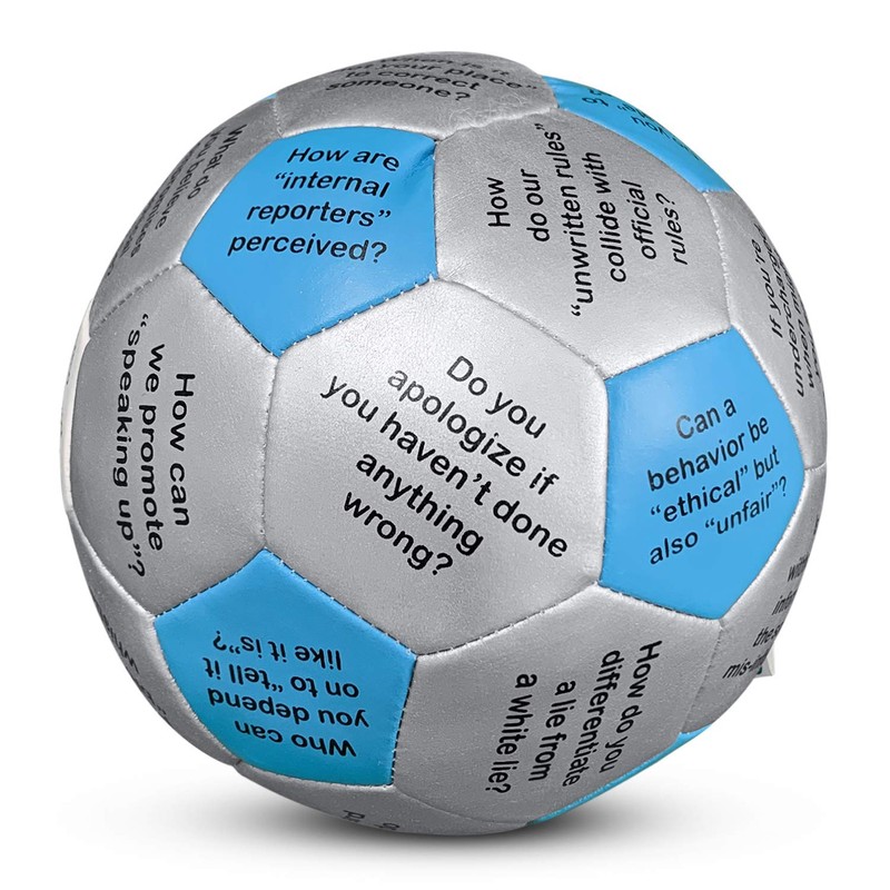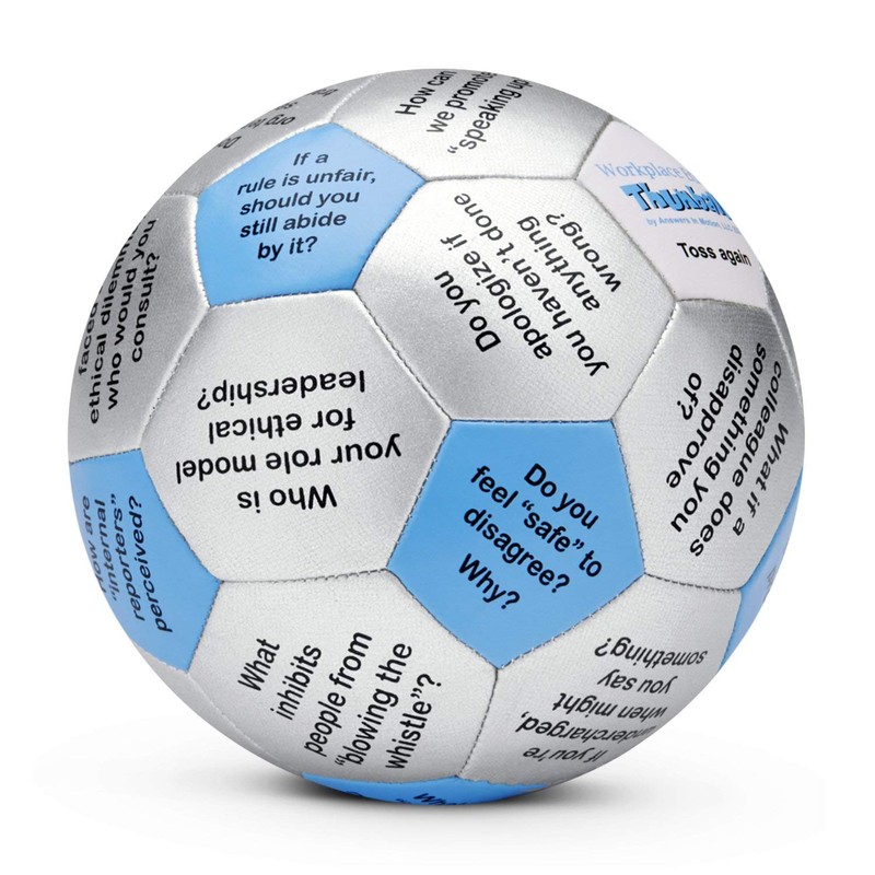 How do you distinguish right from wrong? Is your idea of ethical obligations and responsibilities the same as your colleagues, friends and family? The Ethics Thumball raises questions and fosters discussion about individual and organizational norms and ideals, regarding making and breaking rules, fostering ethical leadership, whistle blowing, bending the truth, and more. Have rich conversations about the types of people you look to as a moral compass; how you'd handle different situations; what integrity, rules, ethics, and fairness mean to you; and how your organization or team handle ethical issues.