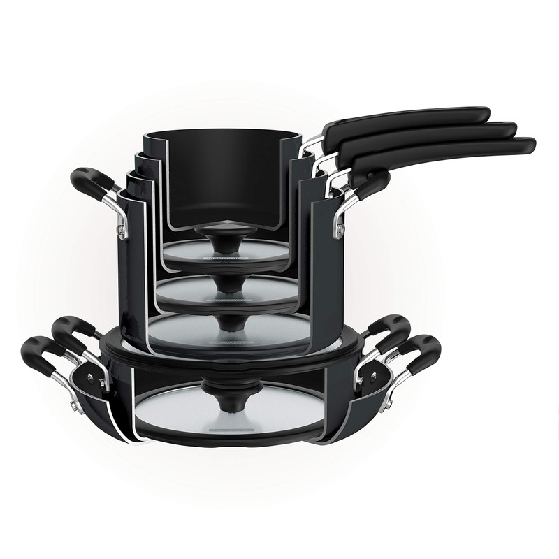- Durable, easy-to-clean, high-quality cookware that saves up to 50% more storage space