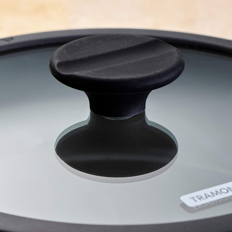 - Heat and shatter-resistant tempered glass lids with a knob that doubles as a spoon rest. Ergonomic, riveted handles that lock together and space pans for more protective storage.