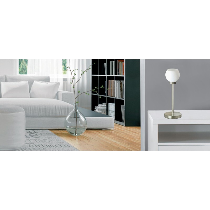 - TRANGO Design eye-catcher LED table lamp series *Earth* bedside lamp, windowsill lamp, desk lamp made of metal in matt nickel with satin glass shade.