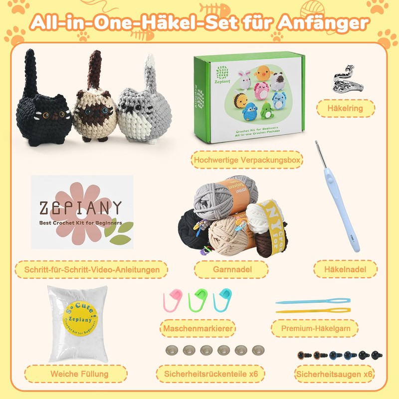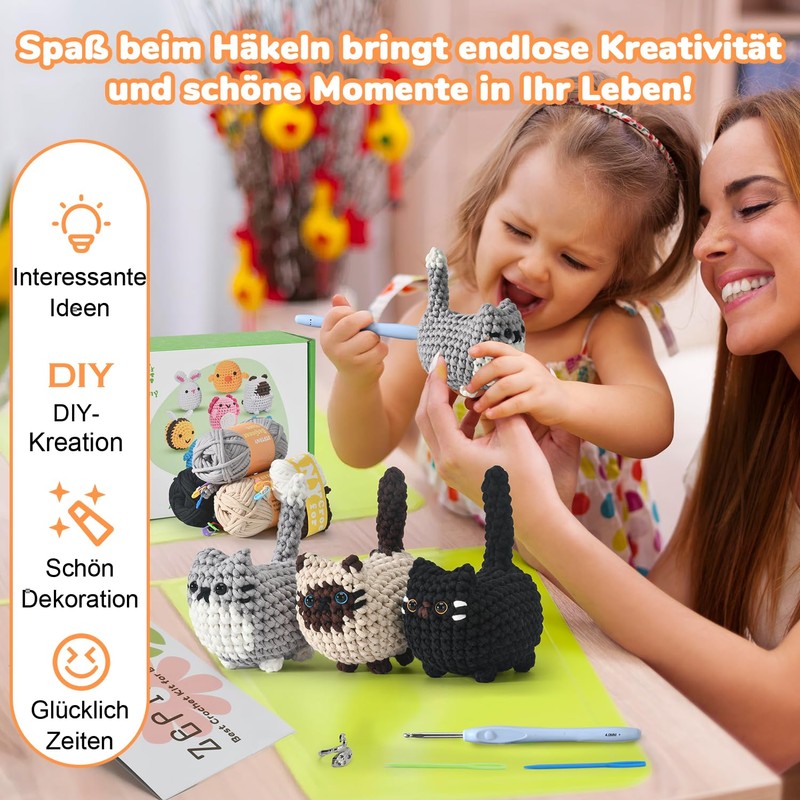 Heckel set, crochet for beginners, crochet set animals, crochet set, crochet set for beginners, animals, step-by-step video explanation, Amigurumi beginners, three cute crocheted cats. Complete crochet for beginners: Dash bag kit for beginners contains everything you need to get started: high-quality crochet yarn, crochet hooks, crochet loops and soft filling, all heckel set as well as You need to get started. Crochet set for beginners: This complete knitting for beginners set contains a pre-made crochet hook for each ball of wool, which makes it easier for beginners to get started crocheting. The wool is firm and not loose, so beginners can recognise the stitches well when crocheting. The wool is designed to harmonise perfectly with the included ergonomic crochet hook, so you can easily learn this craft. 【Complete video can Instructions included: To ensure that your crochet journey runs smoothly, our crochet beginners offer step-by-step video instructions that guide beginners through the entire process from start to finish, so that beginners can quickly learn the skills of crocheting and easily knit cute crochet animals. Fuppys crocheting kit for beginners: crochet set for beginners, do not worry, our products are safe. We use safe crochet sets that are soft and comfortable, with them you can make cute knitted animals that are ideal as knitted toys or home accessories. Warmly made handmade gift: you can give handmade crochet items to your friends and family or give this crochet starter set to friends who love handmade crochet, it is the perfect gift for birthdays, Christmas, New Year, Valentine's Day or others