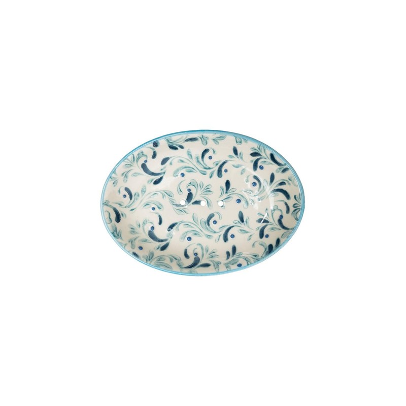 • This soap dish in oval shape and floral prints is a pretty eye-catcher for your sink. With its slightly curved edge and the impressive, hand-stamped pattern, it is not only shapely but also practical.