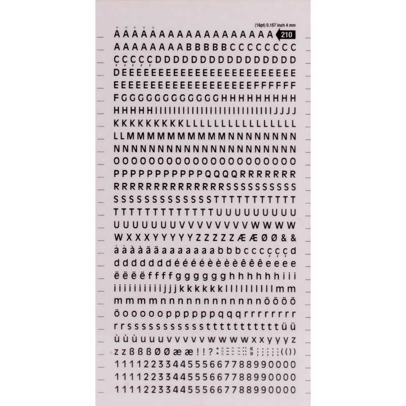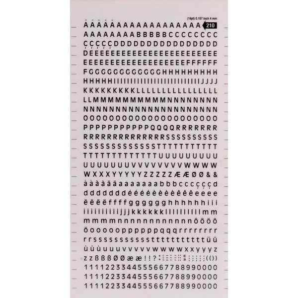 - Coarse letters and lowercase letters and self-adhesive numbers 4 mm (16 pt) high in black colour