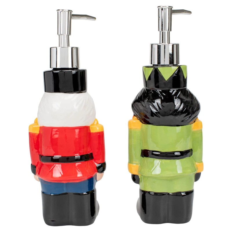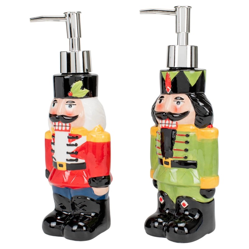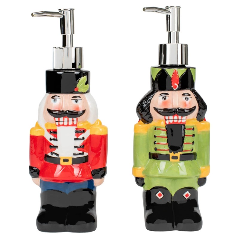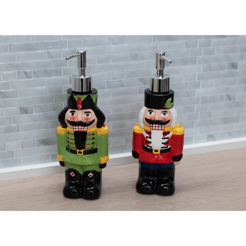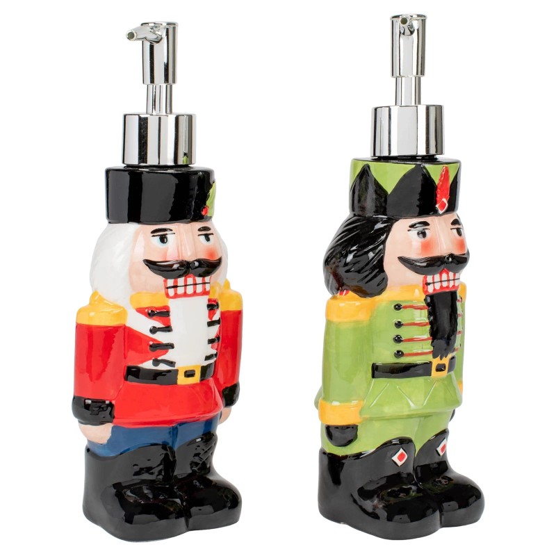 - (Set of 2); Beautiful soap dispensers are the perfect staple item to your holiday home décor; Features detailed nutcrackers decked out in red and green