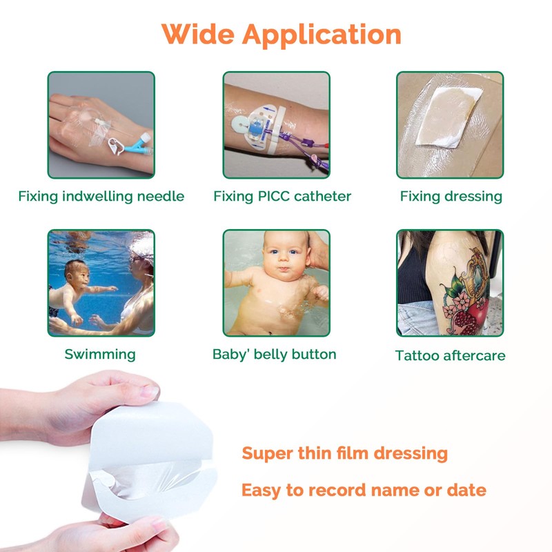 - More than just a wound dressing, this transparent wound dressing has versatile applications, such as a medical fixation IV and non-adhesive dressing, but also as baby's belly button protection and tattoo aftercare, providing comprehensive protection and peace of mind for you and your family