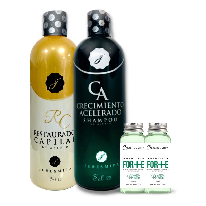 FORMA DE USO: Shampoo Crecimiento Acelerado: Aplicación todos los dias 5 minutos durante la ducha, con un suave masaje. No funciona en alopecia o problemas hormonales. Restaurador: Tratamiento sellador para cabello, enriquecido con colágeno, ceramidas y proteína natural, además de una molécula activadora del agua que se adhiere al cabello cuando la evaporación ocurre. Sella la cutícula mientras consolida una capa protectora sobre el cabello.